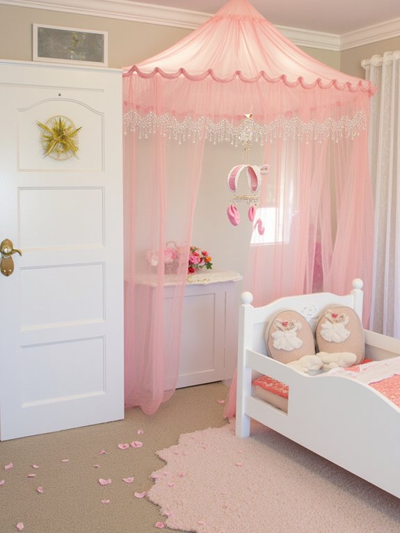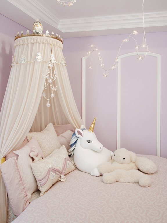 The perfect setup combines aesthetic appeal with practical functionality, featuring essential items like a child’s vanity with crown details and themed storage solutions. These carefully chosen components work together to create a special space that encourages creative play while maintaining organization and room for growth.