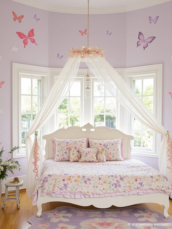 The butterfly garden dream room features soft pastel walls decorated with delicate butterfly decals in pink, purple, and mint green tones. Garden-themed bedding with butterfly and flower patterns creates a peaceful sleeping environment, while sheer curtains and coordinated wall art bring the design together.