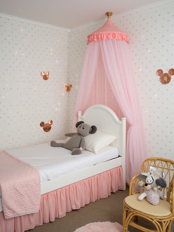 The Polka Dot Mouse Haven combines Minnie Mouse-inspired elements with cheerful polka dot patterns to create an enchanting bedroom theme. Pink and white dots adorn the walls and bedding, while mouse silhouettes and iconic bow motifs add whimsical charm throughout the space.