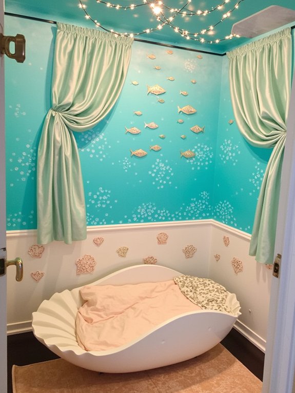 A mermaid-themed bedroom transforms an ordinary space into an enchanting underwater oasis for toddlers. With soft pastel colors and ocean-inspired decor, the room becomes a magical lagoon where children can explore their imagination through underwater adventures.