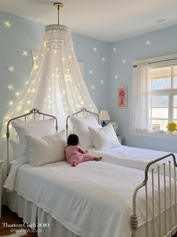 The immersive atmosphere comes to life through carefully selected elements like twinkling string lights draped across a sheer white canopy, transforming an ordinary bedroom into a frosty retreat perfect for sisterly bonding and imagination-filled evenings.