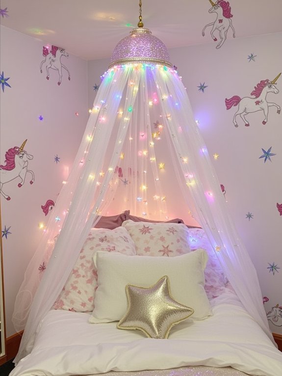 The suite features essential components like adorable unicorn wall decals, plush accessories, and twinkling fairy lights that create a dreamy atmosphere. Pastel rainbow accents on curtains and throw pillows complete this enchanting retreat where little ones can drift into magical dreams surrounded by their favorite mythical creatures.