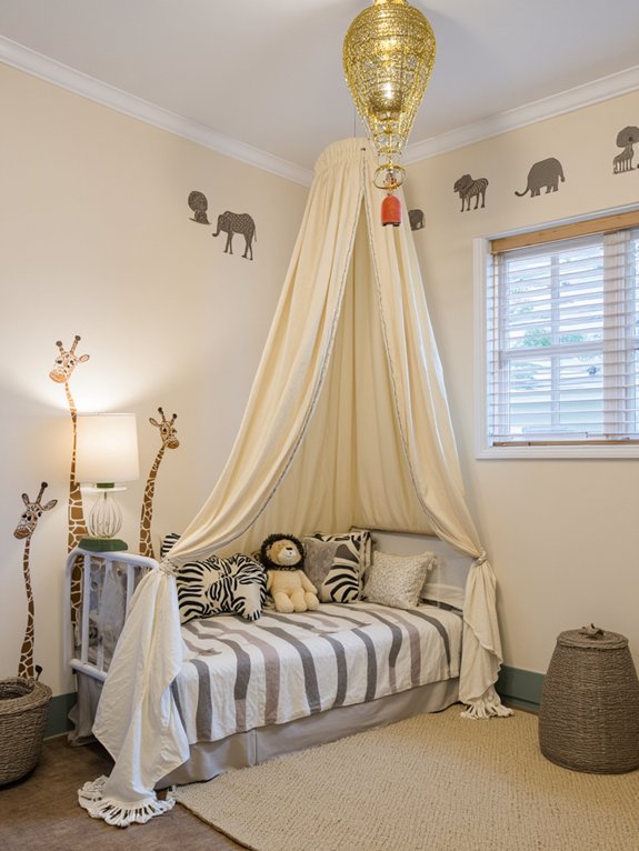 A Wild Safari Sleep Zone transforms an ordinary bedroom into an immersive wilderness retreat. By combining warm earth tones, leafy wall decals, and authentic safari-themed elements like bamboo curtains and animal prints, the space creates an exciting atmosphere for young explorers.