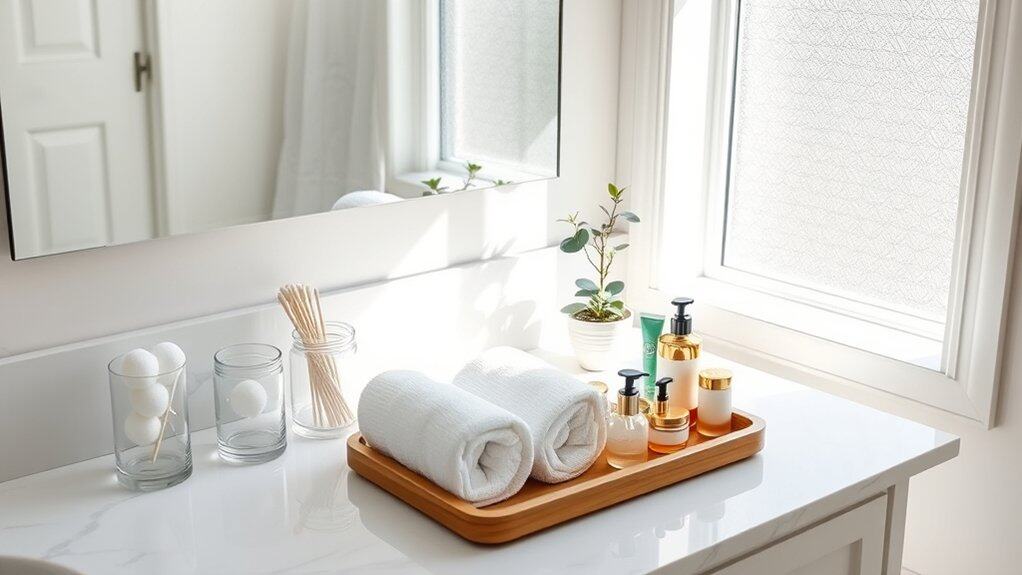 For additional organization, use smaller containers within your main tray to keep items contained. Transfer bulk items like cotton swabs, cotton balls, and bath salts into decorative containers that match your aesthetic. Keep countertop items to a minimum by storing less frequently used products in cabinets or drawers.