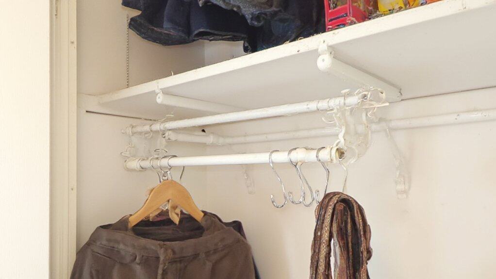 Installing over-door hooks is a simple and cost-effective way to maximize storage space in your closet. These hooks fit over the top of any standard door, providing instant hanging space for items like scarves, belts, hats, or even lightweight bags. Choose hooks that are adjustable or have a slim profile to guarantee they don’t interfere with the door’s operation.