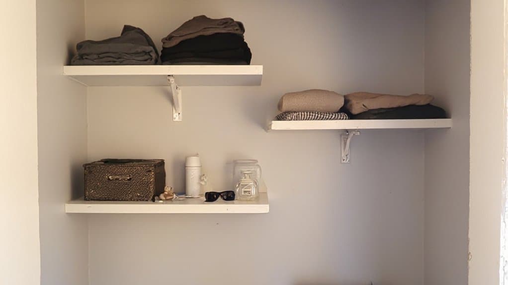 Mounting wall-mounted shelves is an excellent way to maximize storage space in your closet without cluttering the floor. Start by measuring the available wall space and choosing shelves that fit both the dimensions and your aesthetic preferences. Use a stud finder to locate studs in the wall for secure mounting, or use wall anchors if studs are not available, guaranteeing the shelves can hold the weight of your items.