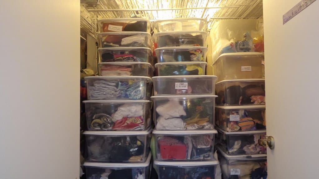 To maintain an organized system, place frequently used items in easily accessible bins at eye level, while storing less-used items higher up or in less convenient spots. Regularly declutter the bins to prevent overstuffing, and consider adding dividers inside larger bins to separate smaller items like socks or belts. This method keeps your closet tidy and guarantees everything has a designated place.