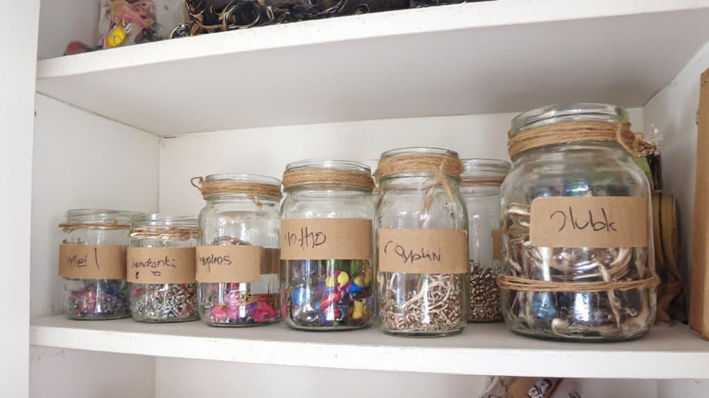 To implement this storage solution, place the jars on closet shelves or inside drawers to keep items contained and visible. Group similar items together, like hair ties in one jar and buttons in another, to maintain order and accessibility. For added stability, secure the lids tightly or attach the jars to a shelf with adhesive mounts to prevent tipping.