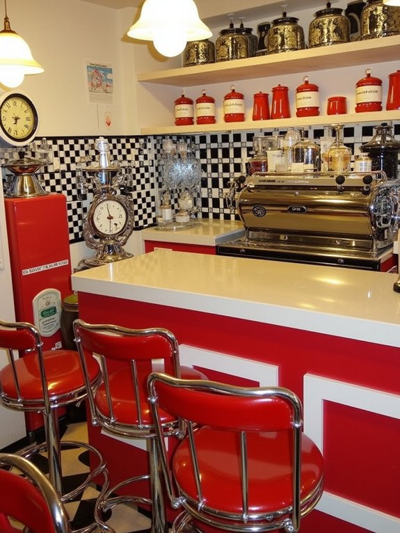 Create a charming retro coffee corner in your kitchen that transports you back to the 1950s American diner era. The foundation starts with a chrome-trimmed counter or table, complemented by classic diner-style bar stools for authentic seating.