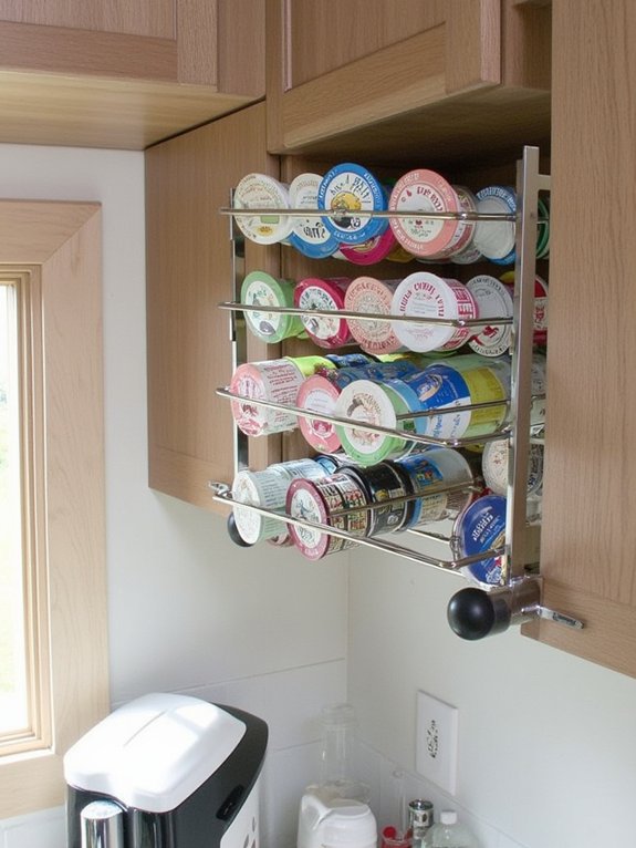 An under-cabinet coffee pod organizer transforms unused space into efficient storage while keeping countertops clear. This mounting solution tucks neatly beneath kitchen cabinets, providing easy access to your coffee pod collection through a sliding rack system.