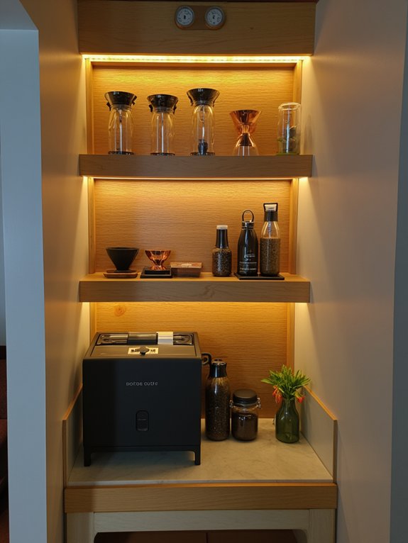 The installation requires 2-3 durable shelves spaced appropriately to accommodate coffee makers and accessories. LED strip lighting beneath each shelf not only illuminates your coffee essentials but also adds a warm, inviting ambiance to the space, transforming a plain corner into an attractive beverage center.