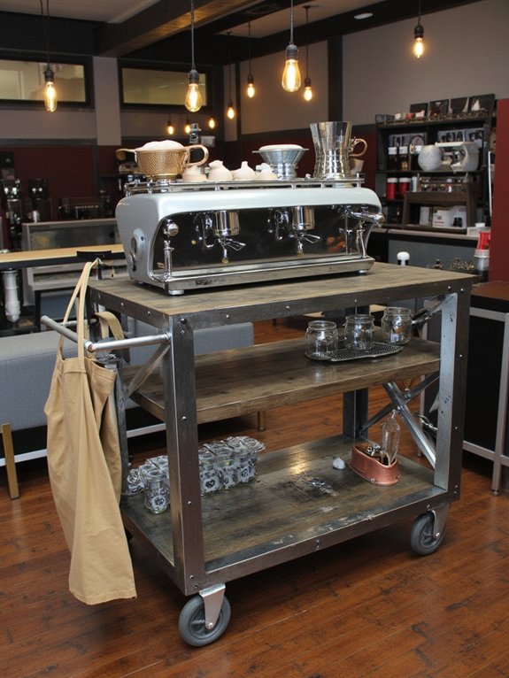 An industrial metal coffee cart combines functionality with trendy aesthetics, offering a mobile solution for coffee service. Its raw metal construction and minimalist design create an eye-catching station that can be equipped with essential brewing tools and storage options.