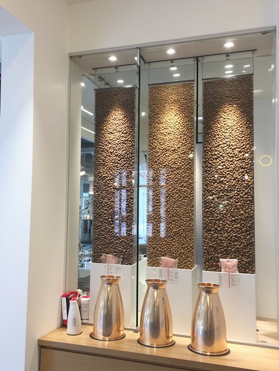 A vertical coffee bean display combines practicality with visual appeal by mounting clear acrylic tubes on your wall. The transparent containers showcase different varieties of coffee beans while keeping them easily accessible for brewing. The vertical arrangement creates an artistic focal point that maximizes space and adds a professional touch to any coffee station.