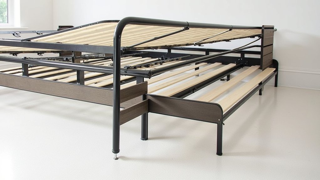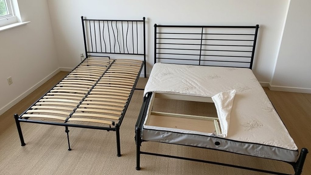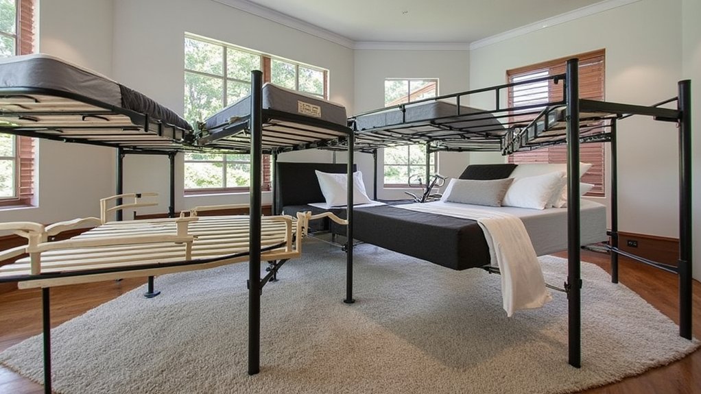 Throughout history, you’ve seen bed support systems transform from simple platforms to complex engineered solutions. Early designs used ropes and wooden slats, while the 1800s introduced the classic box spring. Today’s bed frame innovations focus on adjustability and mattress compatibility.