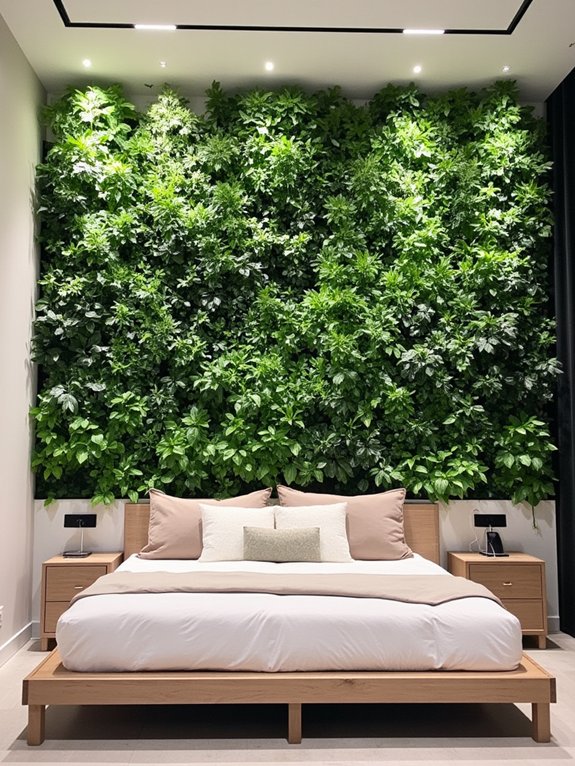 A vertical plant wall display transforms basement bedrooms by mounting greenery directly on walls, maximizing floor space while adding natural elements. Living walls help combat the artificial atmosphere of basement spaces and improve air quality through natural humidity control and oxygen production.