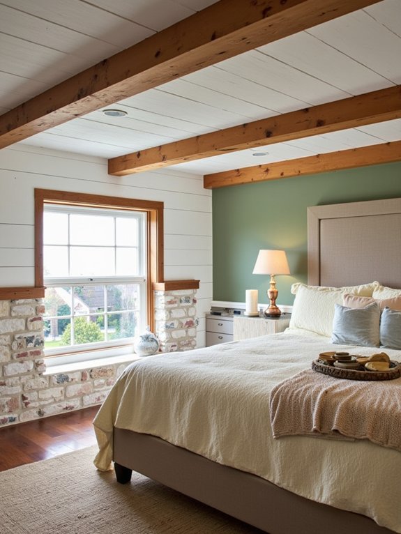 The rustic ceiling treatment can be enhanced through thoughtful design details like vintage pendant lighting suspended from beams, clear protective sealants that highlight natural wood grain, and decorative wrought iron hardware at beam joints. These complementary elements work together to create an authentic, warm atmosphere that elevates the entire room’s design.