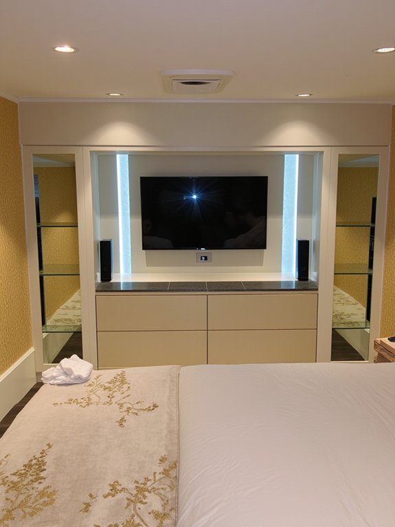 Built-in storage solutions along the walls house media equipment and collections, while professionally installed surround sound speakers deliver premium audio. The entertainment center follows recommended screen distance ratios, ensuring comfortable viewing while maintaining the room’s dual functionality as a bedroom and entertainment space.