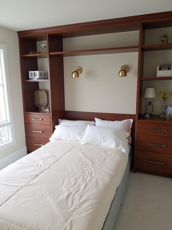 The design incorporates built-in LED lighting and flanking storage cabinets, transforming basement areas into versatile spaces that transition easily between daytime activities and nighttime rest. This multifunctional approach allows homeowners to efficiently utilize their basement for various purposes, from a home office to guest accommodations, without sacrificing style or comfort.