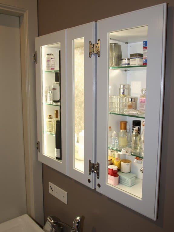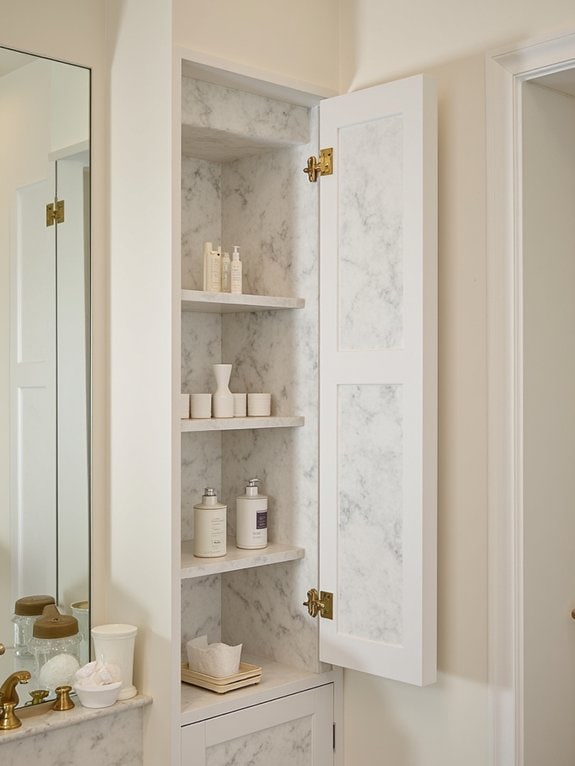 Turn your bathroom mirror into a practical storage solution by installing a recessed cabinet behind it. This space-saving design keeps toiletries organized and easily accessible while maintaining a clean, clutter-free countertop appearance.