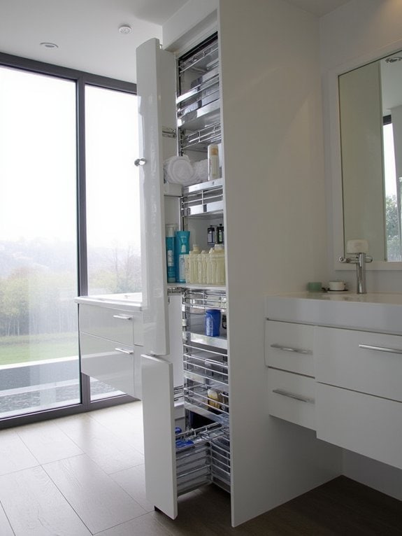 The pull-out storage tower maximizes unused vertical bathroom space with a slim-profile design. Its adjustable shelving system and built-in dividers transform narrow gaps between fixtures into organized storage for toiletries, makeup, and accessories.