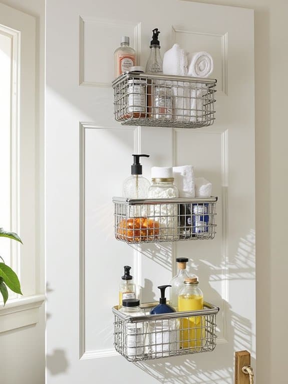Over-door storage basket systems transform unused door space into functional storage without requiring permanent installation. These organizers hang securely over standard door frames, featuring multiple tiers of deep wire baskets perfect for bathroom essentials and toiletries.