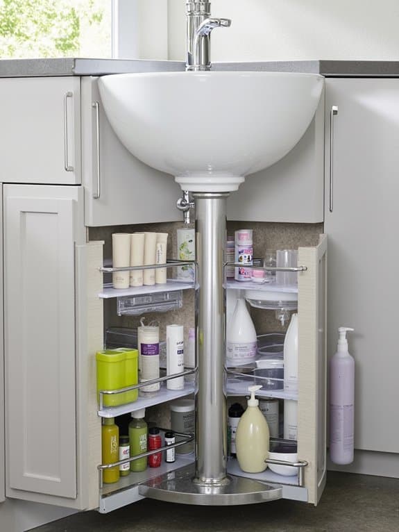 The U-shaped design accommodates plumbing while utilizing corner spaces effectively. Features include pull-out storage drawers with adjustable dividers, non-slip shelf liner to prevent shifting during rotation, and removable bins for easy cleaning. This organization system eliminates blind reaching under sinks while keeping supplies neatly arranged and accessible.
