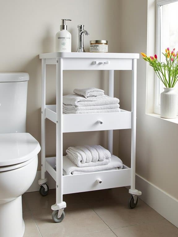 This slim rolling storage unit provides a space-saving solution for tight bathroom spaces, measuring just 6-8 inches wide. The mobile cart features four adjustable shelves with protective lips and smooth-rolling casters that lock for stability.