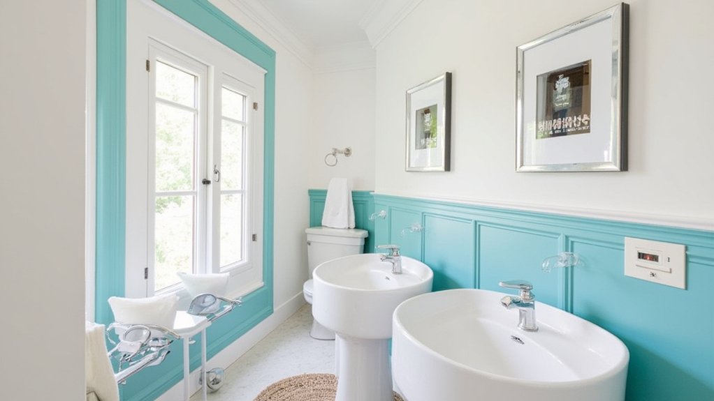 Consider painting your small bathroom with coastal teal trim to add a fresh, beachy charm to the space. This color instantly opens up tight areas, mimicking ocean vibes. Use it on baseboards or window frames for impact.