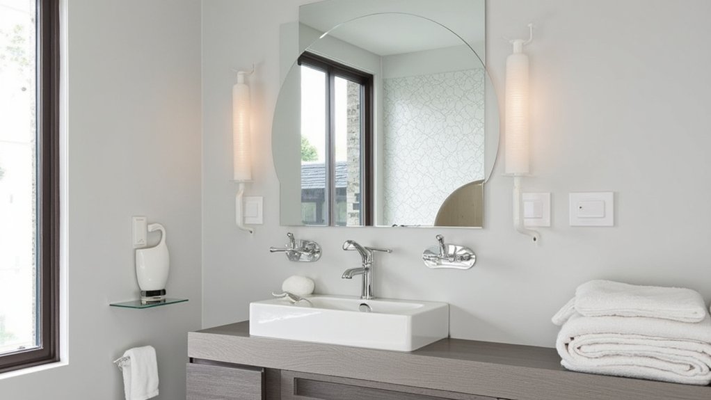 If you’re looking to brighten your small bathroom, consider mint green accents for a fresh, clean vibe. This soft, cool shade instantly opens up tight spaces, making walls seem farther apart. Paint a 3×5-foot accent wall or add mint green towels for a quick refresh in under an hour.