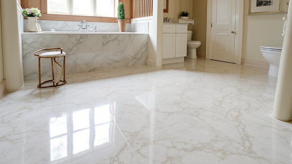 Anyone can elevate their bathroom with the timeless beauty of luxurious marble slabs, a premium flooring choice. You’re choosing elegance with durability when you opt for slabs around 12×12 inches or larger, ensuring a seamless look. Installation takes about 2-3 days for a 5×8-foot bathroom, depending on complexity.