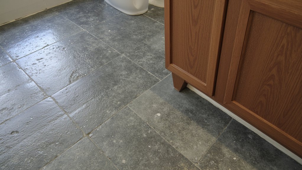 Immerse yourself in a natural, earthy aesthetic with rustic slate tiles for your bathroom flooring. These durable tiles, often 12×12 inches, resist moisture and last over 20 years with proper care. You’ll love their rugged texture and varied gray, green, or rust hues that transform your space.