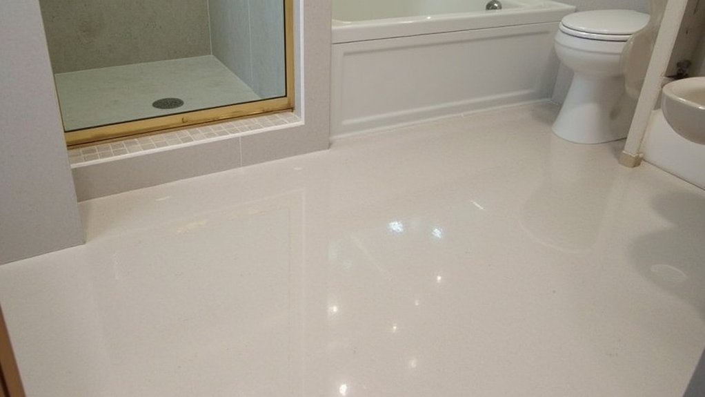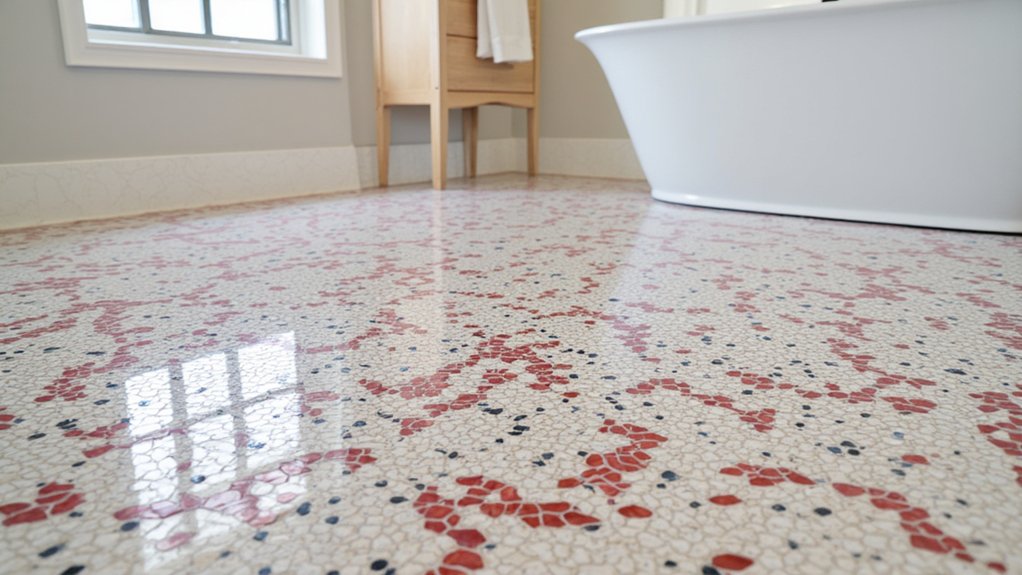 While modern epoxy coatings bring a sleek shine, let’s shift focus to the timeless charm of unique terrazzo designs for your bathroom flooring. You can transform your space with this durable, stylish option that’s been around for centuries. “Terrazzo offers endless customization,” says flooring expert Jane Miller. Imagine a 5×7-foot bathroom floor finished in just two days with these ideas: