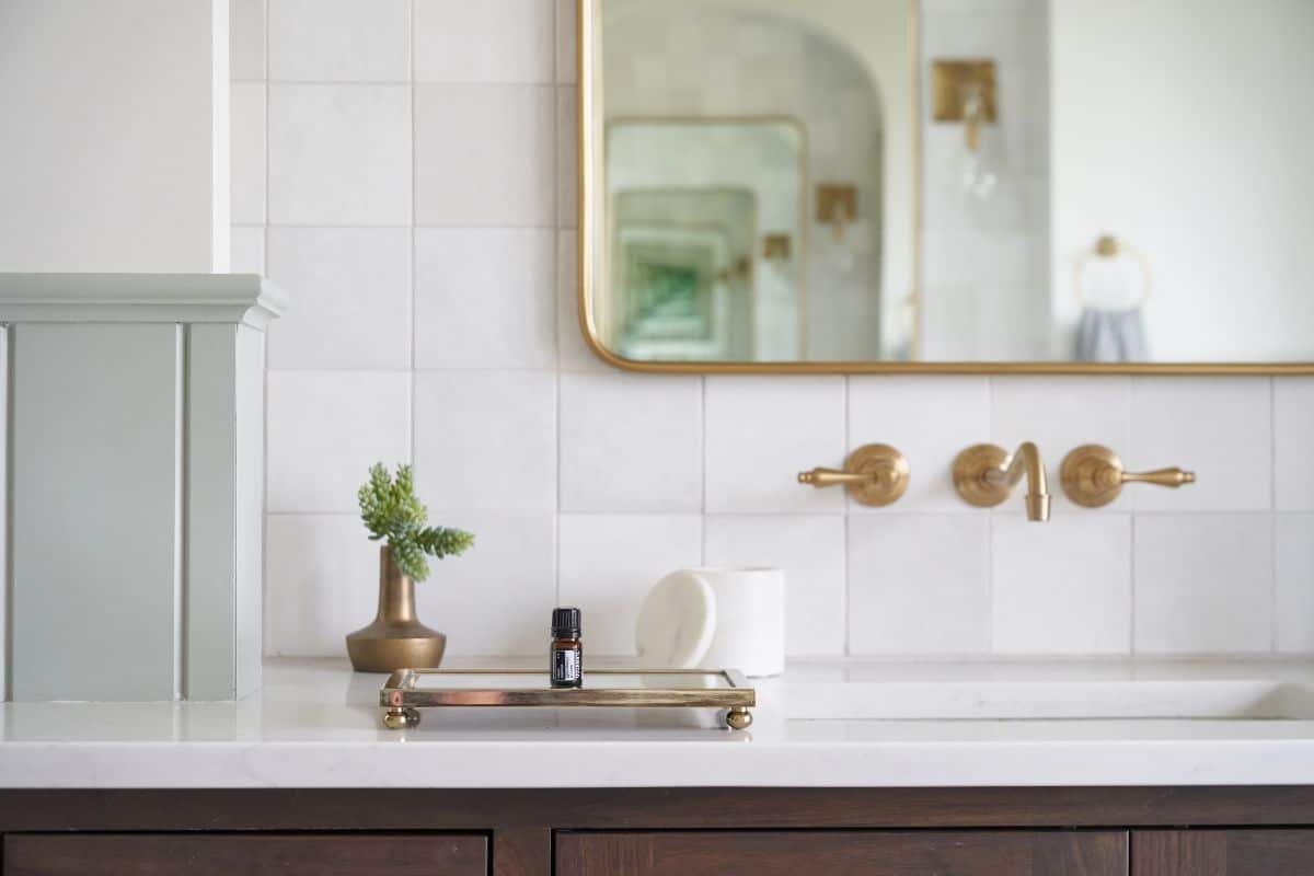 A vanity tray on the counter can corral smaller items like perfumes, lotions, and other daily essentials, making them easily accessible and neat.