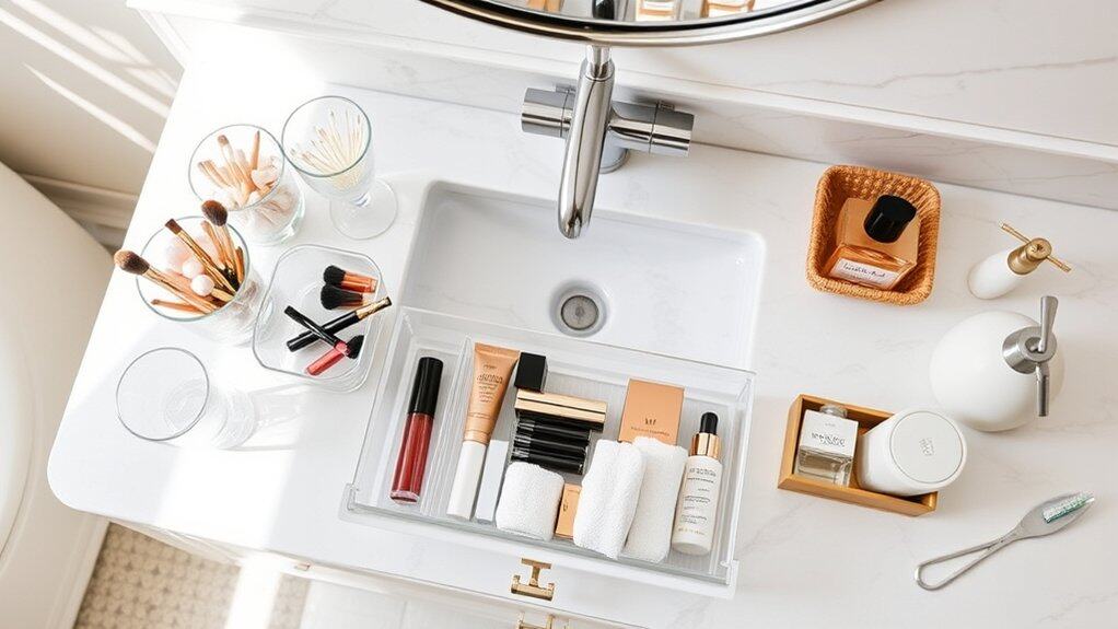 Begin by clearing your vanity counter and drawers completely. Sort morning essentials into categories: skincare, dental care, hair products, makeup, and grooming tools.