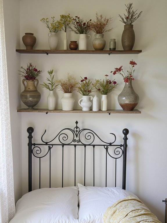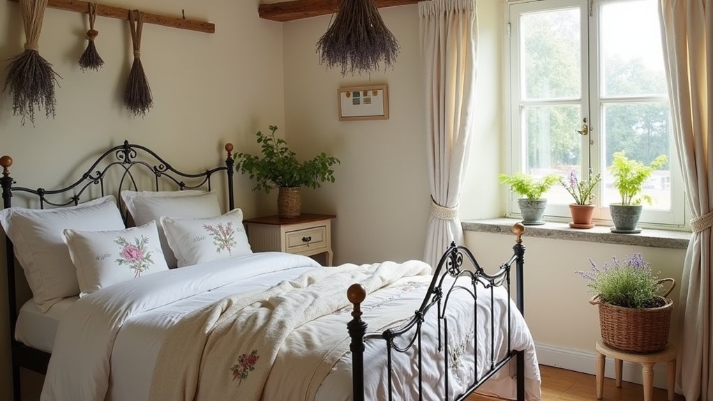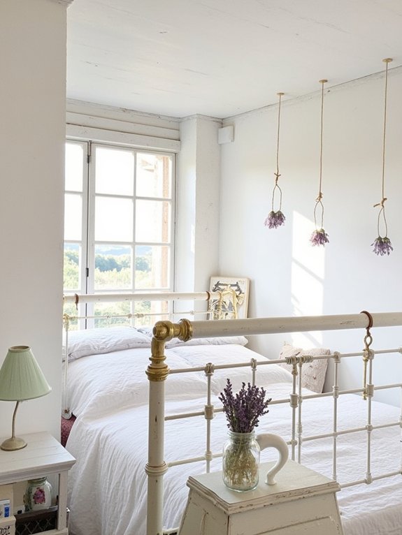 Dried lavender bundles add natural beauty and soothing aromatherapy to bedroom spaces. These versatile decorative elements combine practical fragrance with vintage-inspired charm when hung from beams or mounted on walls.