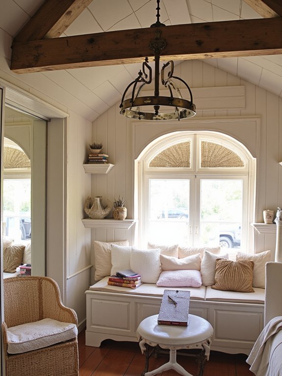 The nook’s essential elements include wall-mounted shelving for beloved books, a weathered leather chair positioned near natural light, and classic brass lighting for evening reading. Handmade quilts, embroidered pillows, and a distressed wooden side table complete the cozy atmosphere, creating an inviting spot for literary adventures.