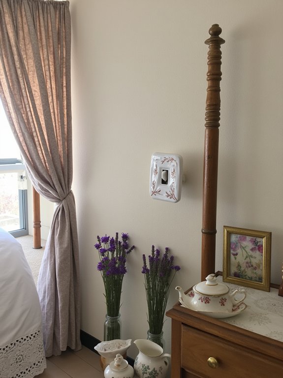 A hand-painted ceramic light switch transforms a basic functional item into a decorative accent piece that enhances cottagecore bedroom decor. The customized switch plate features delicate hand-painted designs like floral patterns or pastoral scenes that complement the room’s aesthetic while adding artistic flair to an often overlooked detail.