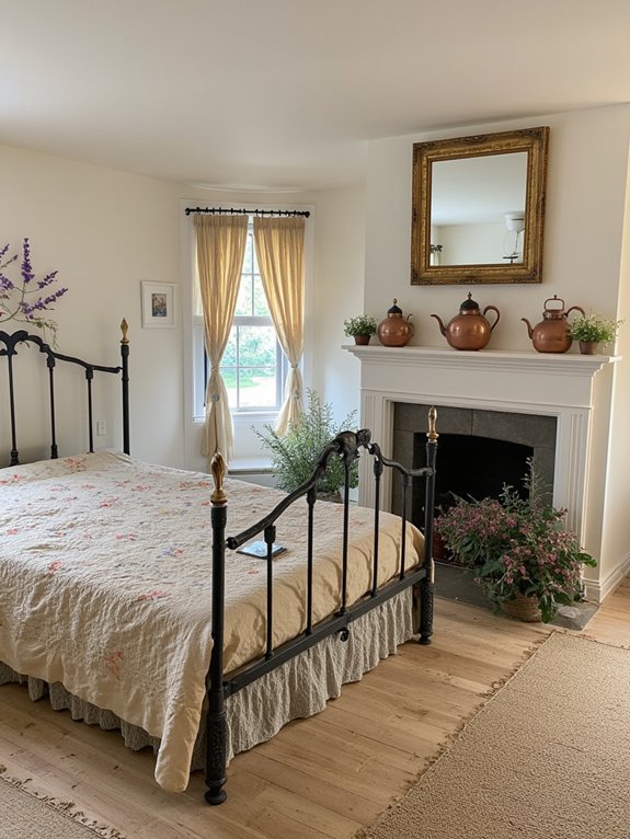 An antique cast iron fireplace serves as a striking Victorian centerpiece in a cottagecore bedroom, combining ornate period details with practical functionality. Its classic design and intricate metalwork instantly elevate the room’s aesthetic while providing a natural focal point.