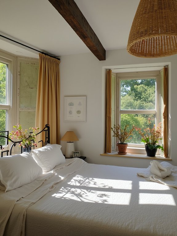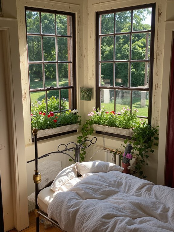 Window box planters add vintage charm to cottagecore bedroom windows, creating a seamless transition between indoor and outdoor spaces. These decorative elements transform ordinary windows into enchanting garden displays that enhance both the interior and exterior aesthetics.