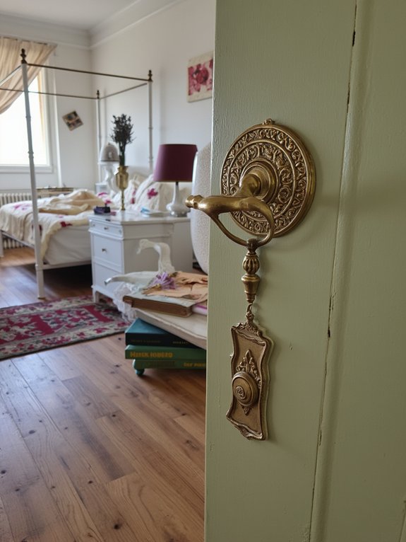 Antique brass door knobs add vintage character and warm metallic accents to cottagecore bedroom designs. These historical hardware pieces transform ordinary doors into elegant focal points while providing authentic period details through their aged finishes and ornate styling.
