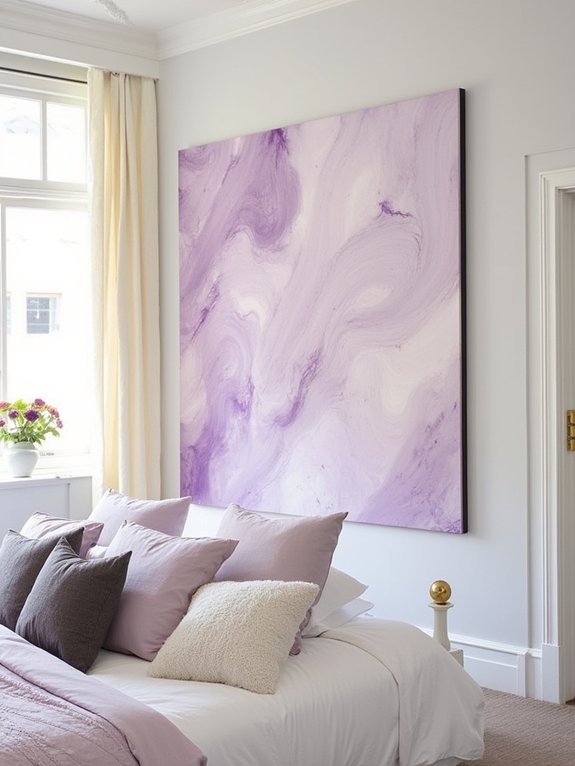Abstract wall canvases featuring lavender tones create a striking focal point while promoting a sense of calm in bedroom spaces. The interplay of light and deep purple hues, combined with flowing brushstrokes, adds sophisticated visual interest to any wall.