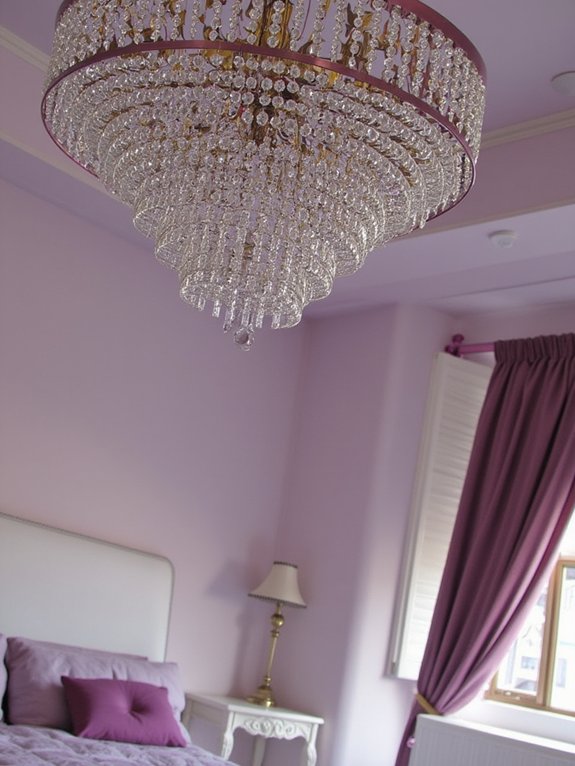 A lavender crystal chandelier serves as a striking focal point in bedroom design, combining functional lighting with decorative elegance. When properly installed 30-36 inches from the ceiling, these fixtures cast enchanting purple-tinted reflections throughout the space while providing optimal illumination.