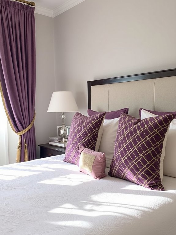 The pillows can be layered in various sizes from 16 to 20 inches and mixed textures like smooth silk and plush velvet. This combination of materials and dimensions adds depth to the overall design while maintaining a cohesive color palette that pairs relaxing lavender with glamorous gold touches.