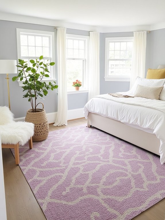 To maintain the rug’s beauty, choose a quality wool blend with subtle lavender tones that complement the room’s decor. Regular maintenance includes weekly vacuuming, rotating the rug every 6 months, and annual professional cleaning to preserve its delicate hues.