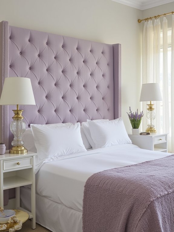 A lavender tufted linen headboard combines luxury and functionality in bedroom decor. The deep diamond tufting creates elegant dimension while providing comfort for sitting up in bed. The natural linen fabric offers both visual warmth and practical benefits like dirt resistance and breathability.