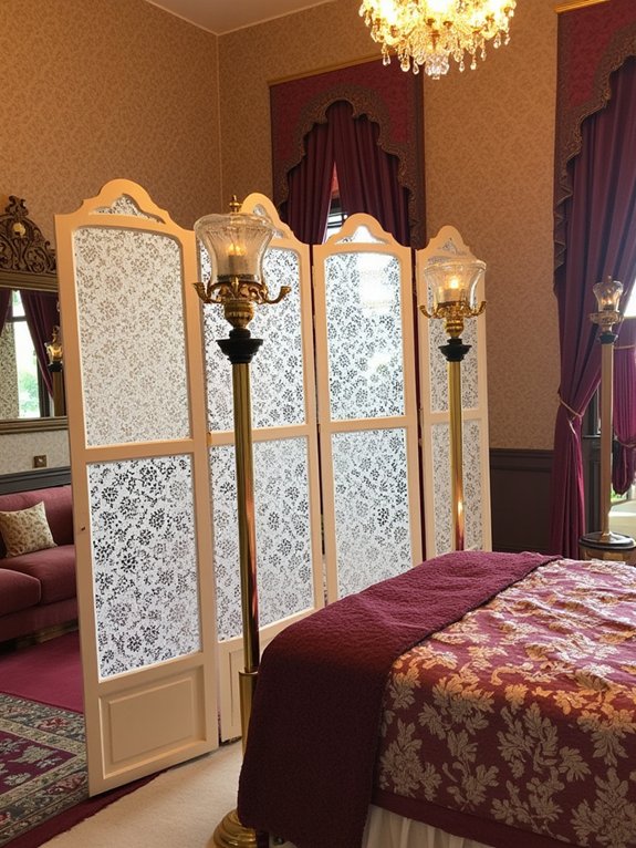 Victorian dressing screens combined elegance and function, featuring delicate lace panels set within carved wooden frames. These tall, hinged room dividers allowed filtered light while ensuring privacy in bedrooms and dressing chambers, with their intricate floral or geometric patterns creating ethereal shadows.