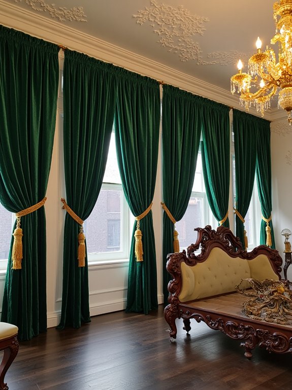 Victorian velvet curtain panels bring dramatic elegance and authenticity to period bedroom designs. The rich fabric adds luxurious texture while providing essential light control and privacy. These floor-length panels typically feature jewel tones and are often paired with sheer underlays for adjustable lighting.