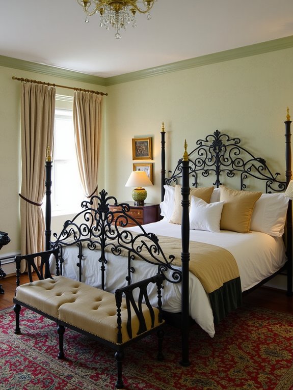 Victorian cast iron beds epitomize 19th-century bedroom design through their ornate scrollwork and detailed motifs. These beds combine robust durability with elegant aesthetics, featuring brass finials and intricate botanical patterns that showcase the period’s superior metalwork craftsmanship.
