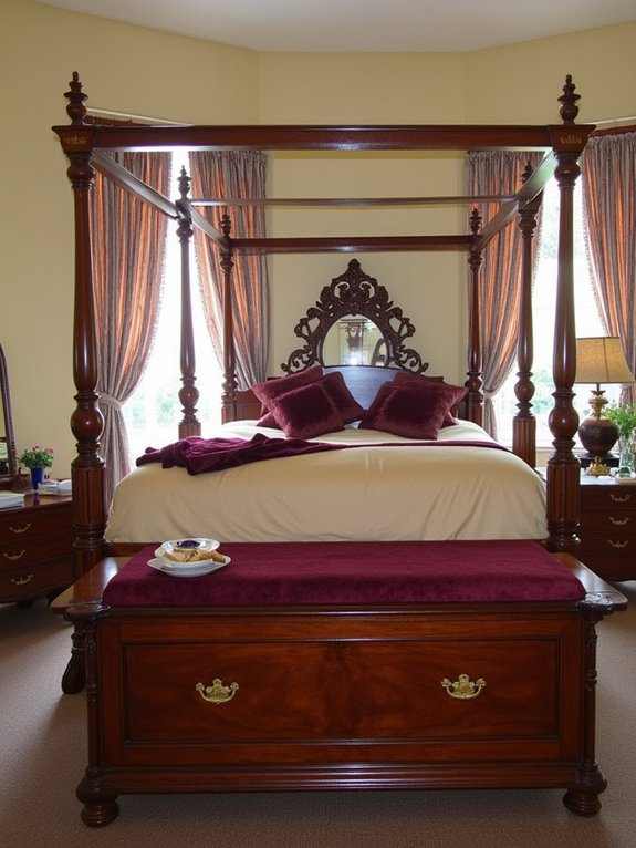 Victorian cedar storage chests, crafted in the mid-to-late 1800s, were essential bedroom furniture pieces that served dual purposes. These expertly constructed chests protected valuable textiles while enhancing room aesthetics with their refined craftsmanship and decorative elements.