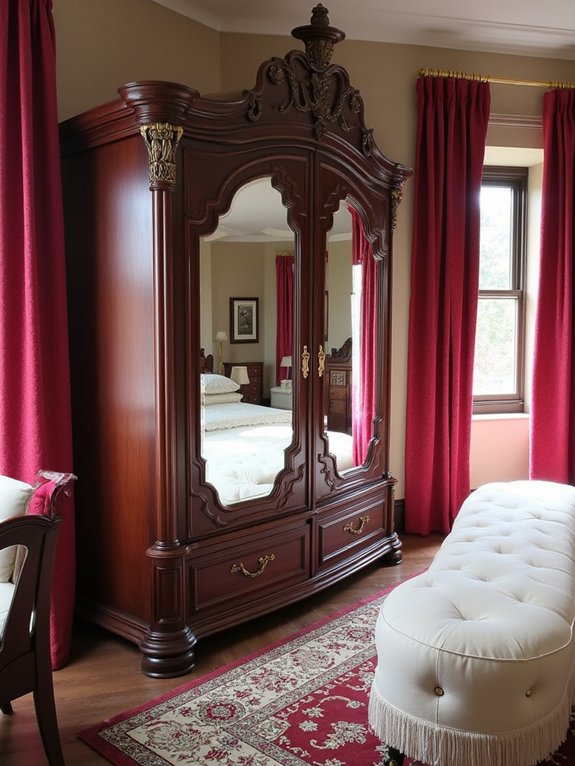 Victorian mahogany armoires represent significant bedroom furniture pieces from the 19th century. These grand storage units, crafted from rich mahogany wood, feature ornate hand-carved decorations, brass hardware, and often include beveled mirrors on their doors. Standing approximately 7 feet tall and 4-5 feet wide, they provided essential clothing storage in homes lacking built-in closets.